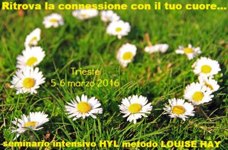 SABATO 5 E DOMENICA 6 MARZO 2016 Corso Ufficiale HEAL YOUR LIFE® a Trieste in via Beccaria 7 a Trieste - c/o Gendai Reiki Italia orario 9.30-18.00 Due giornate in cui sarai amorevolmente guidato a entrare in profondo contatto con te stesso permettendoti di: • individuare e trasformare i tuoi pensieri e convinzioni limitanti • imparare ad approvarti e accettarti, • avere maggior fiducia e amore per te stesso, • lasciare andare rabbia e vecchie emozioni legate al passato, • aprirti al perdono verso te stesso e gli altri • individuare e lasciar andare gli schemi mentali e familiari che ancora ti condizionano negativamente, • sperimentare la connessione corpo-mente e la sua potenza guaritrice • creare le tue affermazioni personali • potrai così scrivere la tua nuova storia... • ...e attuarla utilizzando gli strumenti appresi al corso. Due giorni di piacevole teoria, esercizi pratici e visualizzazioni ideate da Louise Hay per operare una trasformazione su quattro livelli fisico, emotivo, mentale e spirituale e dare una nuova direzione ai tuoi pensieri e alla tua vita e ritrovare la pace e la serenità interiore. Il Seminario Intensivo Heal Your Life® è un’esperienza unica, un grande aiuto per aprire il cuore all’Amore. Trainer del corso: Luisa Serra Insegnante Certificata Heal Your Life® Al termine del corso verrà rilasciato l'attestato di partecipazione Due giornate PRATICHE, ricche di ESERCIZI e VISUALIZZAZIONI in cui potrai: • Fare TUO un metodo collaudato che ha portato guarigione, benessere e amore nella vita di milioni di persone in tutto il mondo • INDIVIDUARE gli schemi mentali e familiari che ti condizionano negativamente e non ti permettono di raggiungere ciò che desideri, e IMPARARE come liberartene per sempre • Trascorrere due giornate di crescita STIMOLANTI e UNICHE dove apprendere e sperimentare tanti strumenti utili per scrivere la tua nuova storia • SENTIRTI maggiormente CONNESSO/A agli altri e a TE STESSO/A • RITROVARE un senso più alto per la tua vita, il TUO benessere INTERIORE Al termine del corso verrà rilasciato l'attestato di partecipazione. PROMOZIONE PER LE ISCRIZIONI ENTRO IL 24 FEBBRAIO 2016: € 190,00* anziché € 260,00 (prezzo ufficiale H.Y.L. Italia) il corso si terrà presso la sede Gendai Reiki Italia a Trieste (* prezzo comprensivo della quota associativa annuale alla Gendai Reiki Italia di € 25,00) CORSO A NUMERO CHIUSO Puoi riservare OGGI STESSO il tuo posto scrivendo a: me@luisaserra.com o tel-sms-whatsapp 3334577536 e usufruire della promozione! N.B.: con l'iscrizione alla Gendai Reiki Italia potrai partecipare alle numerose attività dell'Associazione volte al benessere e al miglioramento. Sconto 50% per chi ha già partecipato al Seminario Intensivo. INFO E PRENOTAZIONI: mail: me@luisaserra.com tel/sms/whatsapp: 333 4577536 Luisa Serra - Insegnante certificata Heal Your Life® Trainer - Personal Coach - Deep Trance Healing www.luisaserra.com / me@luisaserra.com / cell. 333 4577536 Riceve su appuntamento a: Trieste - Via Santa Caterina 5 Udine - Via Savorgnana 27 Skype - serraluisats Promuove: Ahau Eventi Olistici / www.ahaueventi.com / ahau.eventi@gmail.com